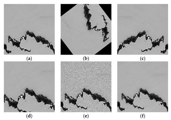 Data augmentation: (a) origin image, (b) rotation, (c) flipping, (d) crop, (e) adding Gaussian noise, and (f) adding blur.