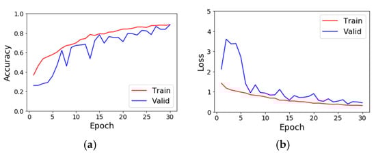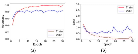 During the training process of our CNN model, the difference between the true class and corresponding predicted class were calculated by the cross-entropy loss function as in Equation (2). Through the optimization of parameters in the network, our target was to minimize the loss function for the training dataset X.
