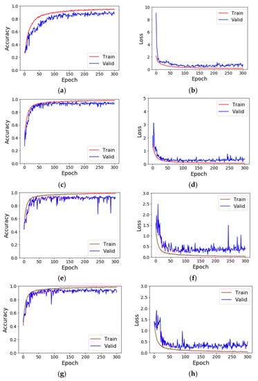 Model 11 was trained for the fine tuning dropout parameters with epochs of 300, and the results are listed in Table 6. Model 16 achieved a validation accuracy of 94.3% and outperformed other models. The accuracy and loss plots of the four tested models are shown in Figure 6. The learning rate was increasing until around 100–150 epochs in Figure 6a. The training and validation accuracy climbed until about 50–100 epochs and then plateaued as seen in Figure 6c,e,g, but overfitting was displayed as worse in Models 17 and 18. Thus, Model 16 was chosen as our final model that converged fast and had high validation accuracy of 94.3% with a training time of about 1 h and 46 min. The schematic architecture of Model 16 is shown in Figure 3.