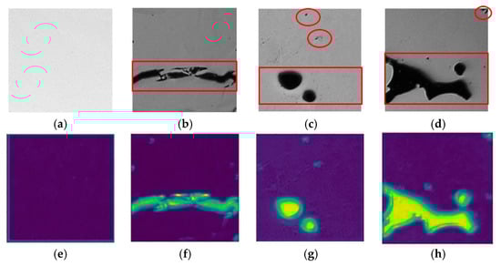 Attention maps can be obtained for a given input image with back-propagation on a CNN model. The value of each pixel on the attention map is able to reveal to what extent the same pixel on the input image makes contributions to the final output of the network [18,19]. Therefore, through the attention maps, it can intuitively analyze which part of the AM build metal images attracts the attention of the network. Figure 8 includes the AM build metallic parts profiles shown in a–d and the corresponding attention maps e–h. The defects were highlighted in the red circles and rectangles in Figure 8a–d. The bright places indicate where the CNN model focuses, as seen in Figure 8e–h, while the dark regions suggest where the network is less interested. Those maps demonstrate that the network pays attention to the defects and verify the effectiveness of our model.