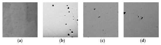 Examples of laser metal deposition (LMD) build parts quality optical images: (a) good quality, (b) crack, (c) gas porosity, and (d) lack of fusion with a resolution of 224 × 224 pixels.