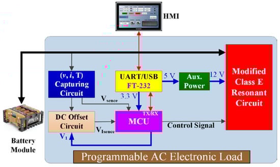 Figure 1 not only provides the gating signal of the MOSFET (metal-oxide-semiconductor field-effect transistor) in the class E resonant circuit but also receives all the sensed signals by the capturing circuit and then communicates with the human–machine interface (HMI) via the USB UART module (FT-232). The HMI is used to preset test conditions and display the tested results, including battery module parameters, battery protection conditions, baud rate, and SOC/SOH.