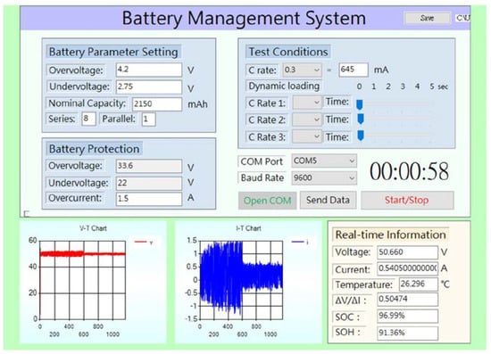 Figure 9 shows the implemented HMI, which is programmed by C# based on Visual Studio. Within the HMI the user can enter all of the battery information and preset related protection conditions, and the HMI can display the monitoring parameters V, I, and T and the estimation value (e.g., SOC/SOH) of the tested battery module. Within the HMI the user can program the test conditions under various C rates. The preset test conditions include three durations; the user can set an independent C rate loading current in each duration to simulate practical work conditions. After obtaining the dynamic parameters, including ∆V and ∆I, from the sensed battery data (V and I), the SOC/SOH can then be estimated by the algorithm proposed in [
