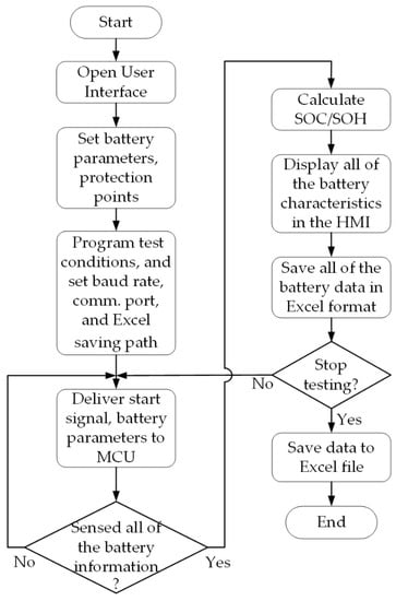 Figure 10 shows a detailed flowchart of the proposed diagnostic procedure used to conduct system integration and management. Hence, the diagnostic information can be displayed in real-time in the HMI when the battery parameters and test conditions are set completely.