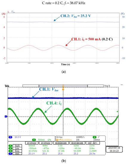 Figure 11 shows the simulated and measured load current waveforms of the AC electronic load under C rate = 0.2 C. All the simulations and experimental results reveal that sinusoidal current waveforms are as previously predicted. When the C rate is changed to 1 C, the simulations and measurement results are demonstrated in