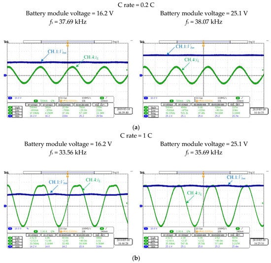 Finally, from integrating the area of the load current waveforms, the energy recycling rate can be calculated. In fact, it is clear that the areas of the positive and negative semi-cycles are different, i.e., the energy drawn from the battery during the test procedure cannot be recycled completely. In addition, although the proposed system has the function of energy recycling when the AC electronic load operates in each operation mode under different operating conditions, the current will cause power consumption when passing through each component, and this consumption cannot be recycled. In general, the Coulomb integral method can be adopted to calculate the SOC by measuring the battery current and integrating it in time. The proposed high-frequency AC electronic load provides a sinusoidal load current, and therefore, the SOC in the positive and negative half cycles can be calculated by the Coulomb integral method to estimate the energy recycling rate. In fact, during the test procedure, the load current will result in some power loss within the battery internal resistances, resonant components, and loop impedances; the energy therefore cannot be recycled completely during the battery module test. In order to accurately calculate the energy recycling rate, we first use the current probe and oscilloscope to capture the actual current waveform of the battery module. Secondly, all the acquired data is transferred to an Excel format file and the areas of the positive semi-cycle and the negative semi-cycle are calculated by using an Excel function. Ideally, energy can be completely recovered; in fact, each component on the electronic load will have some power loss, and the recycling rate will not be the same under different test conditions. In