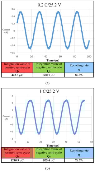 Q2 is 380.1 μcoulombs; i.e., the energy recycling rate is η = 85.9%. However, if the C rate is increased to 1C, the integration value of the positive semi-cycle