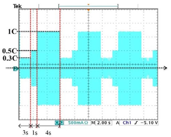 Figure 16 shows an example of measured loading current waveforms which can be applied to evaluate the dynamic characteristics of the lithium battery module. There are three different time intervals in the measured waveform, and different load currents of different C rates can be set separately. The user can preset the aforementioned parameters within the HMI as needed. With regard to the capturing circuit, some parameters of the tested battery module can be obtained to infer the battery module status.
