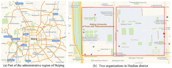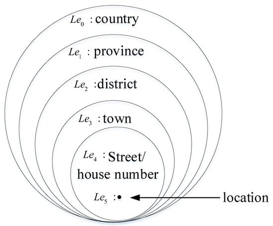In addition, a basic assumption commonly used in existing methods is that all locations are geographic coordinates. For example, we assume user Alice locates in the location , where , and are the time, longitude, and latitude, respectively. That is, the attacker cannot obtain Alice’s location privacy if he cannot infer that Alice locates in . However, existing methods ignore the HSA. In this paper, we divide the HSA into six levels based on common administrative division and use , to denote its level, where corresponds to the organization name and represents a location, as shown in Figure 2. If we do not consider the HSA, we may select dummies that locate in the same organization as the real location. In particular, in the methods that have the TTP-free method and collaboratively achieve anonymity through P2P network, the k users are close to each other and easily belong to the same organizations, which reveals the privacy of users’ organizations.