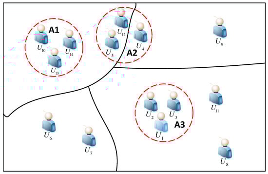 That is to say, if we select dummies that locate in the same organization as the real location, the attacker can easily distinguish the user’s real organization. In fact, the attacker can easily infer that different anonymous groups locate in the same organization. As shown in Figure 3. In Figure 3, the rectangle represents an area containing four organizations: , , , and . Different red circles represent different anonymous groups: , , and . In the example, although users are different in and , the attacker can easily infer that the users in and are in the same organization. It is more serious in densely populated and larger organizations. According to actual need, this paper only considers location privacy protection of and levels.