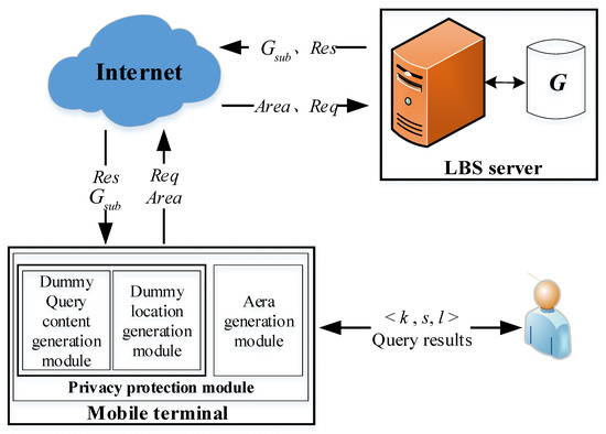 In the LBS system, there are three participants: The user, the mobile terminal, and the LBS server. Additionally, the privacy protection module of the mobile terminal is the core module of the entire system and consists of an generation module, a dummy location generation module, and a dummy content generation module. The LBS server stores the historical location dataset G, provides the historical location sub-dataset for the user to generate dummy locations, and calculates query results for the user. The whole process is described as follows: