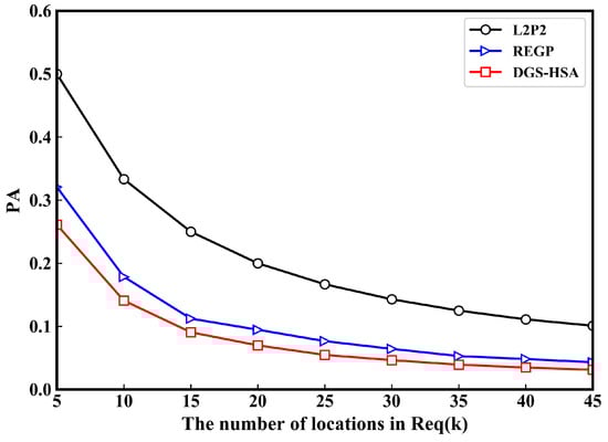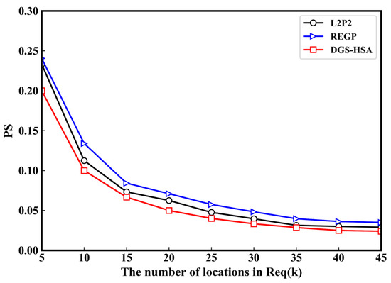 The presented scheme does not submit the user’s real location, and the probability that the real location is recognized is zero. Therefore, this section discusses the relationship between and k. The results are plotted in Figure 7. When k increases, the of all three methods shows a downward trend. The larger k is, the more the number of different organizations of k locations are located, and the smaller is. Among the three methods, DGS-HSA has the best privacy protection effect, and L2P2 is the worst. This is because DGS-HSA considers the hierarchical structure of the address. When we select the dummies, k locations need to be located in s different organizations; however, L2P2 realizes anonymity through an ad-hoc network in which the communication distance is limited, so the distribution of k locations is relatively concentrated. In other words, s is smaller, and in extreme cases (populated dense area) ; when REGP selects dummy locations based on the probability of the historical queries and the locations are scattered as much as possible, s can increase to some extent. Compared with L2P2, REGP has a larger s, so it has a better privacy protection effect. However, when the same historical query probability occurs frequently in some areas, there is no guarantee that k locations will not be in fewer organizations (i.e., s is relatively smaller) and the privacy protection effect will be weakened.