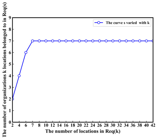 Next, we discuss the equilibrium problem of privacy protection and system overhead for DGS-HSA. From the attacker’s point of view, when the attacker receives a query request , and . Given k, then is also determined. Hence, we mainly discuss, when , with the change of k, how the value of s can balance the privacy protection and system overhead. When we calculate system overhead, for simplicity, each second-level grid contains about 3000 historical locations.