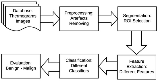As shown in Figure 2 earlier, there are four main stages of a typical breast cancer detection system using digital thermography: (a) image preprocessing including artifact removing, (b) segmentation (extracting Region of Interest (ROI)), (c) feature extraction (i.e. extracting different features representing each sample), and (d) breast tumor detection (i.e. classifying each sample to either normal or abnormal). In the proposed method, these phases are summarized as follows (more details are given in Section 4.1, Section 4.2, Section 4.3 and Section 4.4):