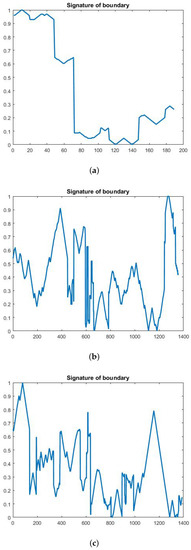 In this paper, we used the boundary signature-based features techniques [23] to extract features from thermogram images. A boundary signature is defined as a 1-D representation of this boundary. It can be seen as a plot of the distance from the boundary centroid to this boundary. Example of applying this technique to thermograms are shown in Figure 8a–c. They show the detected boundary of normal, benign mass and malignant mass. Figure 9a–c show the signatures of the detected boundaries.