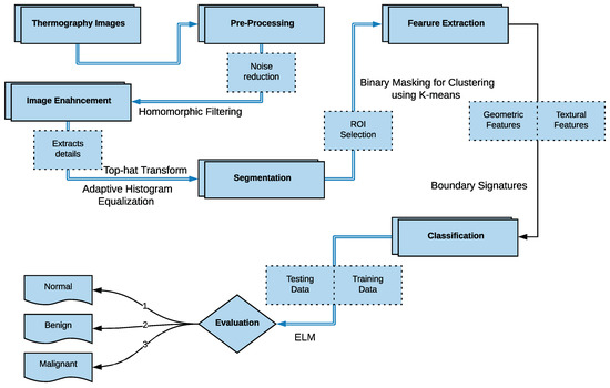 Breast cancer is considered one of the major threats for women’s health all over the world. The World Health Organization (WHO) has reported that 1 in every 12 women could be subject to a breast abnormality during her lifetime. To increase survival rates, it is found that it is very effective to early detect breast cancer. Mammography-based breast cancer screening is the leading technology to achieve this aim. However, it still can not deal with patients with dense breast nor with tumor size less than 2 mm. Thermography-based breast cancer approach can address these problems. In this paper, a thermogram-based breast cancer detection approach is proposed. This approach consists of four phases: (1) Image Pre-processing using homomorphic filtering, top-hat transform and adaptive histogram equalization, (2) ROI Segmentation using binary masking and K-mean clustering, (3) feature extraction using signature boundary, and (4) classification in which two classifiers, Extreme Learning Machine (ELM) and Multilayer Perceptron (MLP), were used and compared. The proposed approach is evaluated using the public dataset, DMR-IR. Various experiment scenarios (e.g., integration between geometrical feature extraction, and textural features extraction) were designed and evaluated using different measurements (i.e., accuracy, sensitivity, and specificity). The results showed that ELM-based results were better than MLP-based ones with more than 19%.