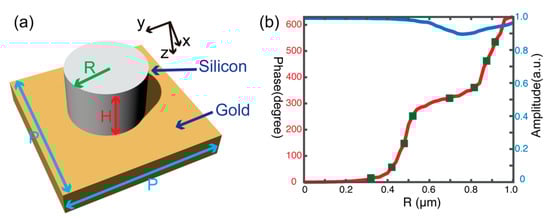 The configuration schematic of the hologram unit is illustrated in Figure 1a. The Si pillar with radius and height was placed on an optically thick, reflecting gold substrate with period . In our demonstration, the wavelength of incident light emitted from a quantum cascade laser (Daylight Solutions, MIRcat-QT™) was 4.7 µm. Rough estimation of the position of the first order of Mie resonance gave a resonant wavelength of , where is the refractive index of Si [9,26]. To be in the parameter range to observe and rely on scattering from the first few resonant modes of the dielectric particles, the height of the nanopillar was chosen as 650 nm. The period of the pillars with square lattice was chosen to be subwavelength in free space but not necessarily subwavelength in the substrate with . Designing properly the resonant response of our scattering elements, the diffracted modes inside the dielectric can be suppressed. To achieve a good phase sampling of our hologram, a 2π variation at the operation wavelength was needed, which was achieved by considering the scattering of light with nanopillars of different radii. Phase and amplitude characterization of the building blocks was performed using the finite-difference time-domain method, considering a normal incident plane wave and characterizing the transmitted fields after reflecting from the interface [27]. Figure 1b shows the simulation results of the reflection phase delay. From this figure, we see that radii ranging from 320 to 920 nm can achieve the 2π variation. The amplitude of the reflection light was nearly 1 of all types of nanopillars due to low loss in Si and almost perfect mirror reflectivity of Au at mid-IR frequency (blue line shown in Figure 1b).