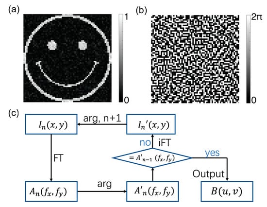 Phase-only holograms, for example, an object producing a smile logo, were designed using the iterative Fourier transform algorithm, see Figure 2a. The numerical process used to define the phase distribution works as follows. First, it calculates the Fourier transform (FT) of the object to obtain its angular spectrum, which could be read as . The phase profile of is obtained as . Second, taking the inverse Fourier transform (iFT) of results in with the phase profile . Taking as a new object and repeating the above iteration process several times until , where the subscript denotes the iteration time, we obtain the final hologram , where (u,v) denotes the hologram placed at a different object plane (x,y). Figure 2b shows the phase-only hologram calculated by the above algorithm composed of 2000 iterations. The iterative Fourier transform algorithm implemented in our manuscript follows the flow chart, see Figure 2c.