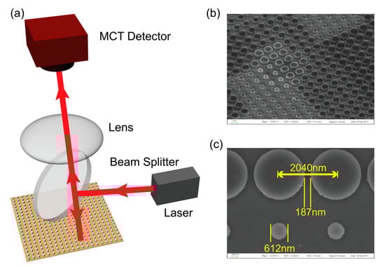 The optical setup built to characterize our devices is shown in Figure 3a. A laser beam from a mid-infrared quantum-cascade laser (4.7 µm, 100 mW) was reflected from the beam splitter and directed to the sample at normal incidence. A CaF2 lens with a focal length of 5 cm was used to FT the reflected light field. The metasurface hologram was placed in the front foci plane of the lens and a mercury cadmium telluride (MCT) detector utilized in two dimensions to scan the back foci plane and collect the spatial field distribution. The size of the MCT detector was 25 μm, indicating that the minimal spatial resolution of the image was 25 μm. The phase-only hologram shown in Figure 2b was discretized to an eight-level hologram, meaning that 2π-phase variation was divided into 0, π/4, π/2, 3π/4, π, 5π/4, 3π/2 and 7π/4 modulation with pillar radii of 320, 420, 480, 560, 720, 820, 880 and 920 nm, respectively.