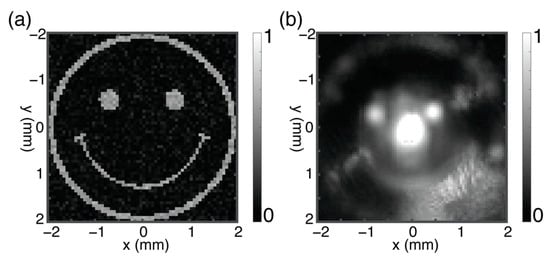 The completed hologram in Figure 3a is illuminated by the laser beam impinging on the interface at normal incidence. The far-field calculated image in Figure 4a shows that some information is lost during the far-field projection, as observed after comparing the image quality obtained numerically and the input object in Figure 2a. This is due to the phase discretization. The ideal resolution of the simulated image is 32.5, which is determined by the total size of the hologram, the pixel size of the hologram and the optical resolution of the lens. At the back foci plane of our imaging setup, an MCT detector is attached on a microdisplacement platform with a scanning step of for scanning the far-field image of the hologram. The detected image with size 2 × 2 mm is shown in Figure 4b. The image has been experimentally reconstructed by considering point-by-point intensity distribution, and assembling the spatial-intensity distribution to recover our expected smiling logo. Note that the bright nose spot in the center of the image is caused by the zeroth-order diffraction of the hologram sample. From the raw data of the measured image, we estimate that the unwanted zeroth-order perturbation is ~19%, indicating that the total efficiency of our metasurface-based hologram is considerably high, up to 81%. We would like to underline the fact that the reported performance could be further increased, notably by properly considering near-field coupling of metasurface building blocks using optimization design methods [30,31,32,33,34,35].