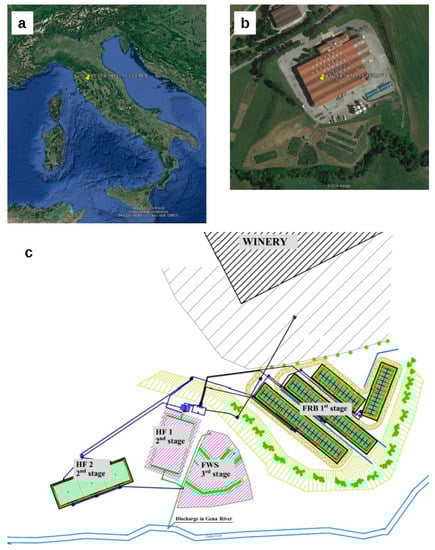Constructed Wetlands (CW) wastewater treatment plant (WWTP) serving the Cecchi winery (Castellina in Chianti, Italy): (a) position; (b) aerial view; (c) planimetry, in which the stages in magenta represent the CW beds refurbished horizontal subsurface flow systems (HF) and recovered free water system (FWS) from the original CW WWTP of 2001.