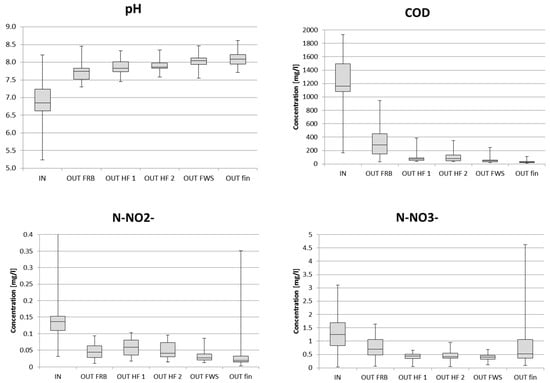 Statistical analysis of pollutant concentrations of wastewater treated by the CW of Cecchi winery at the different stages of the CW of Cecchi winery: influent (IN); effluent from the 1st stage FRB beds (OUT FRB); effluent from the 2nd stage refurbished HF bed (out HF 1); effluent from the 2nd stage HF beds built during the 2009 upgrade (OUT HF 2); effluent from the 3rd stage FWS bed (OUT FWS); effluent from the official effluent sampling point, after the optional sand filter (OUT fin). Data from 19 January 2017 to 14 June 2019.