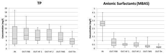 The FRB 1st stage already provided a very efficient and statistically significant removal of COD (mean removal 70.2%) and MBAS (73.4%), as clearly visible from Figure 3. Statistically significant differences were registered for all the stages in terms of COD and MBAS (see Figure 3 and Table 3). This is particularly relevant for the COD parameter; indeed, the high removal efficiencies of the FRB 1st stage would not be enough to respect the water quality standard (mean COD concentration OUT FRB, 345 mg L−1), leading HF 2nd (mean COD concentration OUT HF, 95 mg L−1), and FWS 3rd (mean COD concentration, OUT FWS 57 mg L−1) stages to play a fundamental role in making the CW WWTP effluent suitable for discharge in water body in terms of COD pollutant. The Box-Whisker plot of Figure 3 also evidences the capability of CW to smooth the influent organic load variability, as clear by observing the very high variability of COD concentration in the influent.
