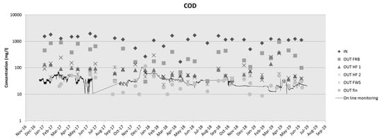 The temporal series of influent and effluent COD concentrations are reported in Figure 4, together with the COD effluent concentration registered by the online sensor every 30 min for almost all the whole monitored period. As visible from Figure 4, the online sensor gave excellent results in following the increasing and decreasing patterns of effluent COD concentration. For instance, the online sensor properly measured the sharp increase (but still far below the effluent COD water quality target of 160 mg L−1) of effluent COD concentration observed from November 2017 to December 2017. Similarly, the subsequent slight decreasing pattern until June 2018 was properly caught. The maintenance procedure also guaranteed good performance in time as visible, for instance, by the proper measurement of a slight increase of COD concentration from June 2019 to July 2019.