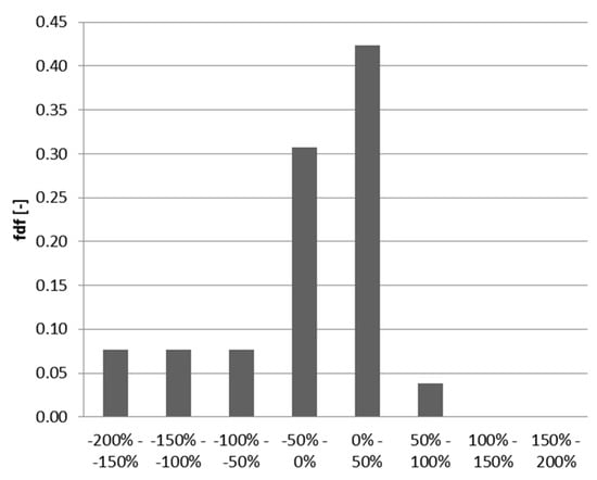 Relative frequency density function of the error between the sampled COD effluent concentration and the daily mean COD effluent concentration monitored by the online sensor. Data from 9 February 2017 to 14 June 2019.