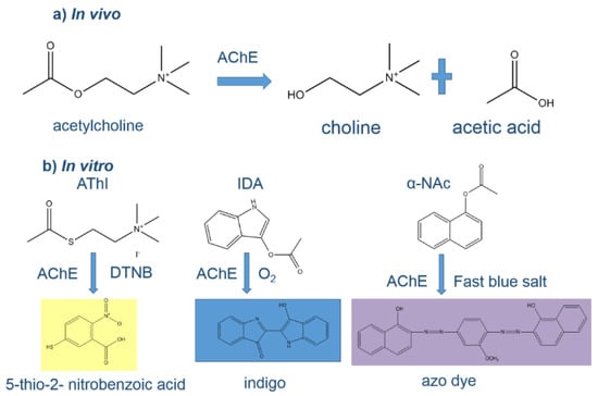 (a) In vivo, the neurotransmitter acetylcholine is hydrolyzed to choline and acetic acid by AChE; (b) in vitro hydrolysis of various substrates (acetylthiocholine iodide (AThI, Ellman’s assay substrate), indoxyl acetate (IDA) and α-naphthyl acetate (α-NAc)) by AChE producing different colored products.