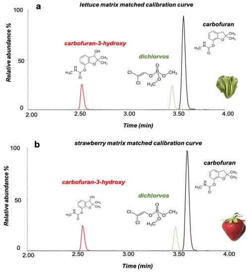 Extracted ion chromatograms (XIC) of carbofuran, carbofuran-3-hydroxy and dichlorvos at 0.020 mg Kg−1 in (a) lettuce and (b) strawberry matrix matched solutions using the LC–MS/MS system.