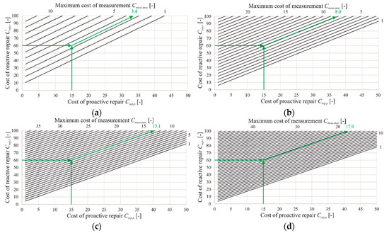 From the presented uncertainties, it was possible to calculate the ratio of the maximum cost of measurement, Cmeas,max, which is still cost effective, as dependent on the cost of proactive and reactive repairs. The calculated Cmeas,max are herein presented graphically through charts in Figure 2, and through Equations (10) and (11). Figure 2. shows the graphs for the ratio of the cost of proactive, Crep,p, and reactive repair, Crep,r, and calculated maximum still cost-effective cost of measurement, Cmeas,max, for four different probabilities of depassivation. In this way, one can easily graphically extract the value of the maximum cost-effective cost of measurement, Cmeas,max, and translate it to a real cost, in a real decision-making situation.
