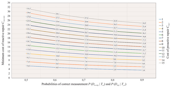 - When observing the unit cost of measurement, Cmeas = 1, the minimum cost of reactive repair, Crep,r,min, which is still cost effective, slightly decreases with the increase in the probabilities of correct measurement, P (Dno-dep | Tno) and P (Ddep | Tyes); and