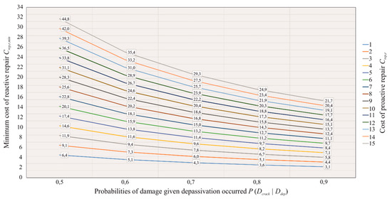 Similar to the probabilities of correct measurement, the influence of the probability of damage given depassivation occurred, P (Dcrack | Ddep), was analyzed. The parameters given in Table 3 were used for the analysis, where additionally, the probability of depassivation was set as Pdep = 0.6 and the probabilities of damage given depassivation occurred, P (Dcrack | Ddep), varied from 0.5 to 0.9. Furthermore, the analysis was performed for the unit cost of measurement, i.e., Cmeas = 1. The results are presented in Figure 4, where one can easily notice the decrease of the minimum cost of reactive repair, Crep,r,min, with the increase of the probability of damage, P (Dcrack | Ddep). However, the decrease is more intensive than in Figure 3, thus emphasizing the high influence of the probabilities of damage once the depassivation occurred, P (Dcrack | Ddep), to the cost effectiveness of measurement.