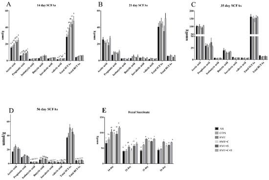 Fecal succinate concentration was measured using an ELISA test kit (mlbio, Shanghai, China) according to the manufacturer’s instructions. The SCFAs concentrations of fecal and plasma in day 14 and 21 were analyzed by a gas chromatographic method according to our previous study []. Total SCFAs in fecal were determined as the sum of analyzed acetate, propionate, butyrate, valerate, isobutyrate and isovalerate. All procedures were performed in duplicate.