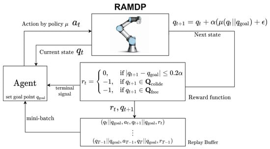 In order to develop a reinforcement learning (RL) based path planning, the robot arm MDP (RAMDP) needs to be defined properly first [17]. The state of the RAMDP is the angle value of each joint of the manipulator where the joint angle belongs to the configuration space . Hence, for collision-free operation of a robot manipulator, in the motion planning, the state belongs to only where n is the number of the joint in the manipulator. In the RAMDP, the action is joint angle variation. Unlike MDP with discrete state and action such as frozen-lake ([17]), the RAMDP under consideration has continuous state (i.e., joint angle) and continuous action (i.e., joint angle variation). Due to this, DDPG or its variants are fit to find the optimal policy for the agent in the RAMDP. In this paper, TD3 (twin delayed DDPG) is employed to find an optimal policy for the continuous action with deterministic policy in the RAMDP. Figure 1 describes how to generate the sample () in the RAMDP. Suppose that arbitrary initial state () and goal state () are given, and that the maximum length of the episode is T. At state , if the action is applied to the RAMDP, is produced from the RAMDP. Then, according to the reward function in (1), the next state and are determined. In view of (1), if does not belong to , then the next state is set as the current state. Furthermore, if the next state is the goal point, then the reward is 0, and otherwise the reward is −1. Then, the whole procedure is repeated until the episode ends. Note that this reward function leads to as short as possible path since TD3 tries to maximize the sum of reward and a longer path implies more −1 reward.