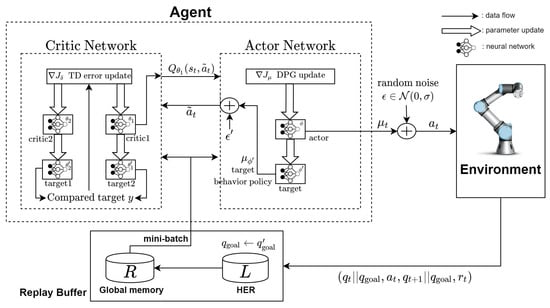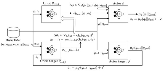 There are two possibilities for the episode to end: (1) the next state becomes the goal state, i.e., , and (2) the length of the episode is T, i.e., and . For both cases, every sample in the form of () is saved in the memory. Note that when , the next state is set to the current state in order to avoid collision. In the worst case, if this happens repeatedly, the agent is trained such that the corresponding episode does not occur. Based on these samples in the memory, the optimal policy is determined in accordance with TD3, which is explained in the next subsection.