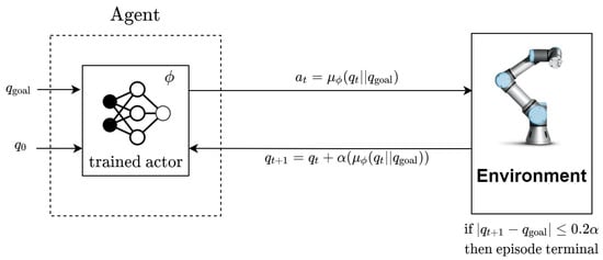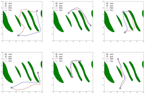 For robot path planning, sampling-based algorithms find feasible paths for the robot manipulator using a graph consisting of randomly sampled nodes and connected edges in the given configuration space [6,7]. PRM (Probabilistic Roadmaps) and RRT (Rapid Exploring Random Trees) are two representatives of sampling-based planning algorithms. PRM consists of two phases. The learning phase samples nodes randomly from collision-free space in the configuration space and makes edges with direction by connecting the sampled nodes. Then, it constructs a graph using the nodes and edges. The query phase finds the optimal path connecting the starting node and goal node in the graph [8,9,10,11,12,13]. Note that the resulting path by PRM is made by connecting the sampled nodes in the configuration space; usually, it is not smooth and might be longer than the optimal path. RRT samples nodes from the neighbor of the starting point in the configuration space, constructs a tree by finding a feasible path from the starting node, and expands the graph until the goal point is reached. It works for various environments and can generate a path quickly, but its optimality is not guaranteed in general [14,15]. More recently, Fast Marching Methods (FMMs) using level sets have been proposed for path planning. The FMMs are mainly about efficiently solving the Eikonal equation whose solution provides the optimal path. It is shown that FMMs lead to an asymptotically optimal path and faster convergence than PRM and RRT [16]. Since FMMs, PRM, and RTT are sampling-based approaches, they need a high number of sampling points for high dimensional configuration space in order to obtain a smoother path, which means that they are computationally demanding in calculating the optimal path for given arbitrary starting and ending points. Also, they can suffer from memory deficiency in high dimensional space. However, in the proposed method, when a TD3 agent is trained, the optimal path can easily be computed (i.e., trained neural network computation).