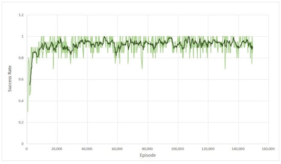 In order to train TD3 with HER for the 2-DOF manipulator, 8100 episodes are used. Figure 4 describes the success ratio of each episode with HER when the network is training. In other words, when the network is learning with arbitrary starting and goal points, sometimes the episodes end at the given goal point but sometimes the episodes end before reaching the given goal point. In Figure 4, the green lines denote the success ratio of every 10 episodes and the thick lines stand for the moving average of the gray lines. Figure 5 shows the reward as the number of the episode increases, i.e., the training is proceeding. The reward converges as the number of the episode increases. In view of the results in Figure 4 and Figure 5, we can see that learning is over successfully.