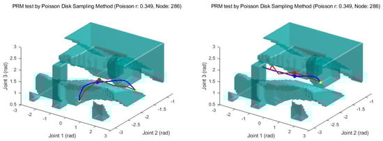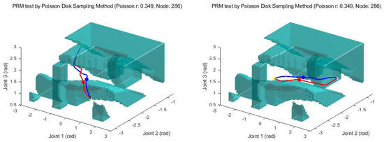 In sampling-based path planning, configuration space (also called joint space for robot manipulators) represents the space of possible joint angles and is a subset of n-dimensional Euclidean space where n denotes the number of the joints of the manipulator. The values of the joint angles of a robot manipulator are denoted as a point in [1,2,34]. The configuration space consists of two subsets: the collision-free space and in which the robot manipulator collides with other obstacles or itself. For motion planning, a discrete representation of the continuous is generated by random sampling. Then a connected graph (roadmap) is obtained. The nodes in the graph denote admissible configuration of the robot manipulators, and the edges connecting any two nodes mean feasible paths (trajectory) between the corresponding configurations. Finally, when the starting and goal configurations and are given, any graph search algorithm is employed to find the shortest path connecting and . There exists a shortest path between and since they are two nodes on the connected graph.
