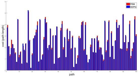 For training, 140000 episodes are used. In view of the converged reward and success ratio in Figure 9 and Figure 10, we can see that the learning is also over successfully. With this result, random starting and goal points are given to the trained network in order to obtain a feasible path between them. Figure 11 shows several examples of generated paths by the trained actor DNN when arbitrary starting points and goal points are given. The red lines are resulting paths by PRM and the blue lines by the proposed method. As seen in the figure, the proposed method results in smoother and shorter paths in general. For the sake of between comparison, 100 arbitrary starting and gold points are used to generate paths using PRM and the proposed method. Figure 12 shows the lengths of the resulting 100 paths. In light of Figure 12, it is obvious that the proposed method generates smoother and shorter paths in general. Note that, in average, the resulting path by the proposed method is shortened by 2.69% compared with the path by PRM.