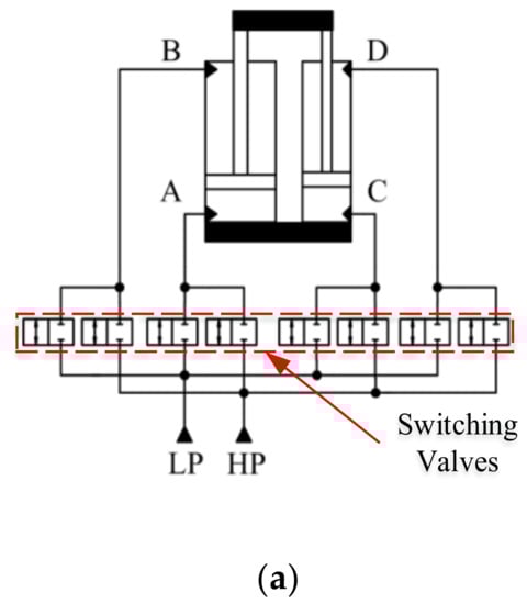 The hydraulic transformer is a new type of hydraulic component based on the constant pressure network secondary regulation system. It can adjust the system pressure to any value within the pressure variation range without throttling loss, and such a process is reversible, which means that the system can output energy to the load or recover energy from the load to the accumulator. However, the low-speed operation stability, the robustness and vibration noise of hydraulic transformer limit its application [16]. Digital hydraulic technology provides two possible solutions. The one is high-speed switching digital hydraulic transformer, which is composed of high-speed switching valves with appropriate hydraulic impedance (Figure 12a); the other is parallel linear digital hydraulic transformer, which is composed of hydraulic cylinders with multi-piston chambers (Figure 12b) [8].