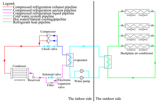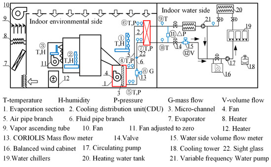 The test unit includes a back plate evaporator side (with cabinet), CDU condensation side, riser, and downcomer. The experimental equipment included an enthalpy difference laboratory, which can create the indoor side temperature and humidity environment conditions required by the backplane heat pipe experiment, open and control the indoor water side equipment system, and provide the cold water supply temperature and flow required by the CDU cooling section experiment; a schematic diagram is shown in Figure 2 below. PT100 temperature sensor (Beijing Huakong Xingye Technology Development Co., Ltd., Beijing, China) was used to measure the refrigerant temperature at the inlet and outlet of the backplane heat pipe evaporation section and CDU condensation section. A K-type thermocouple temperature sensor (Changzhou Anbai Precision Instrument Co., Ltd., Changzhou, Jiangsu, China) was used to measure the wall temperature of the evaporation section of the backplane heat pipe. The pressure sensor was used to measure the refrigerant pressure at the inlet and outlet of the evaporation section and the condensation section of the backplane heat pipe. Coriolis flowmeter (Jiangsu Kingstar Instrument Technology Co., Ltd., Huaian, Jiangsu, China) was used to measure the mass flow of refrigerant in the system. The experimental data measured by the experimental instrument was collected by Agilent data acquisition instrument (Beijing Dongfang Zhongke Integrated Technology Co., Ltd., Beijing, China) and connected to a computer for storage.