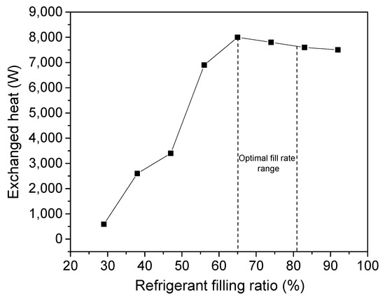 Under the standard working condition, the heat exchange of the backplane air conditioning system changes with the refrigerant filling rate as shown in Figure 3 below. When the air conditioning system was charged with 0.6 kg refrigerant, the refrigerant filling rate was 27.9% and the heat exchange was very low, less than 1 kW. Since the system is in a lower refrigerant filling rate, there is only a small amount of liquid refrigerant at the bottom of the evaporator, and it will soon evaporate into a gaseous refrigerant, resulting in steam in the upper part of the evaporator with small heat capacity and without a liquid film covering the upper surface; so only through the steam heat exchange does the phenomenon of drying up occur, resulting in low heat exchange. With the refrigerant charge increases from 27.9% to 65.3% and the heat exchange of the system also significantly increases, reaching 7.8 kW, which is eight times the previous one. Due to this range of filling rate, with the increase of filling rate, the coverage of liquid film in the evaporator increases, so the heat exchange rate of phase change latent heat increases rapidly. However, as the refrigerant filling rate of the system is continuously increased, the heat exchange of the system is gradually reduced, because there is too much refrigerant in the evaporator, the length of the lower liquid pool is longer, and the length of the latent heat exchange is reduced. At the same time, the refrigerant at the inlet of the evaporator is supercooled, which will also reduce the heat exchange of the evaporator. When the refrigerant filling rate of the system is higher than 80%, all the refrigerants in the evaporator are in a liquid phase state and cannot operate normally. Therefore, the range of 65–79% is the best range of the backplane heat pipe air conditioning system, and the heat transfer performance of the system is the best under the best range of the filling rate.