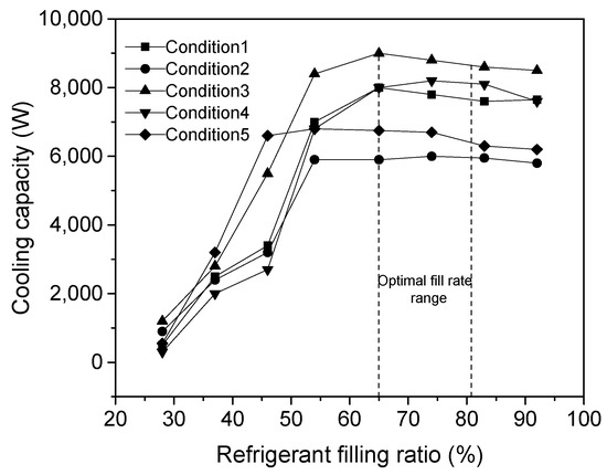 Relationship between cooling capacity and refrigerant filling rate under different temperature conditions.