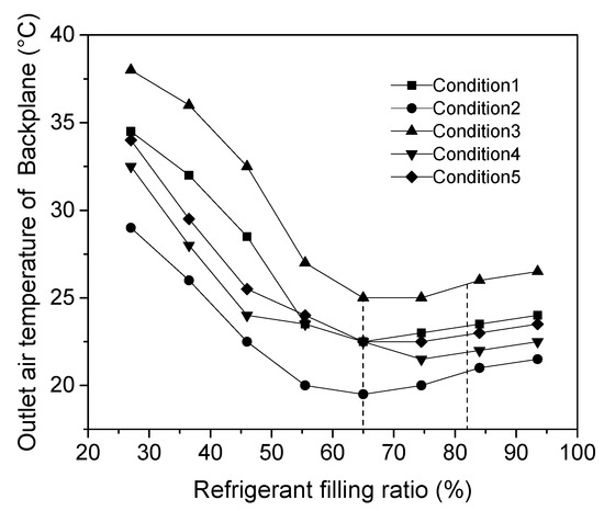 Since the driving force of the operation of the backplane heat pipe air conditioning system depends on the temperature difference between the air in the evaporation section of the heat pipe and the outdoor condensation side, as well as the height difference between the evaporation section and the condensation section, the temperature condition in the machine room is generally maintained between 20 °C and 25 °C; but when the server in the room goes down, power is off or the outdoor weather conditions change dramatically, the temperature may change suddenly. Therefore, it is necessary to study the influence of different temperature conditions on the optimal refrigerant filling rate and heat exchange performance of the system, which is conducive to ensure that the backplane heat pipe air conditioning system is in the optimal operation state during the actual operation process, and the air outlet temperature meets the air supply temperature requirements of the data room. Table 3 shows the five different operating conditions set in the experiment. Under the five operating conditions, the experiments with different filling rates were carried out respectively.