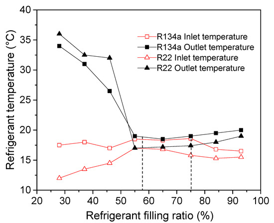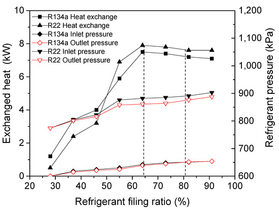 - The heat exchange, pressure, and refrigerant temperature of R134a and R22 are the same with the change of filling rate, but under the same conditions, the heat exchange of R134a is lower than that of R22 on the whole. Under the optimum filling rate, the temperature at the inlet and outlet of the refrigerant in the evaporator is almost the same. The range of refrigerant filling rate corresponding to the maximum heat exchange and the minimum temperature difference between the inlet and outlet of the refrigerant in the evaporator is about 65–75%, which is the optimal refrigerant filling rate of the system.