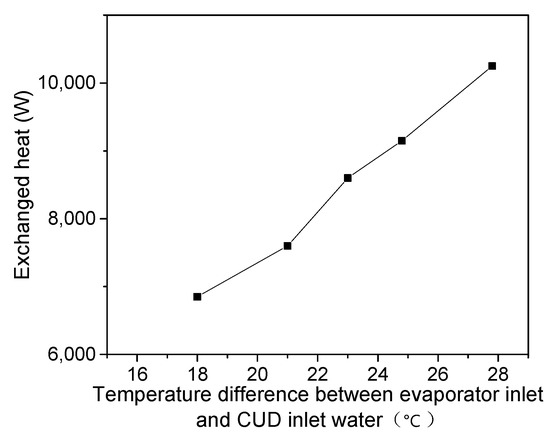 It can be seen from Figure 10 that under the optimal refrigerant filling rate, when the air volume flow rate at the evaporator side and the water flow at the condenser side remain unchanged, the heat exchange and the temperature difference between the air inlet temperature of the evaporator and the CDU water inlet temperature are almost linear.
