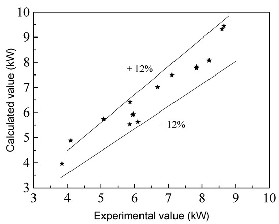 Based on the previous set of optimal filling rate conditions, the experimental data of different inlet air volume, inlet air temperature, and inlet water temperature were substituted into the model (Equation (16)) for calculation. The relative error between the calculated value and the experimental value is shown in Figure 11 below. As shown, the error of the prediction formula for the overall heat transfer of the system is about ±12%, which can basically meet the requirements for quickly predicting the heat transfer of the system in practical applications. When the backplane heat pipe is in the optimal refrigerant filling rate condition, it is considered that the system is in the optimal operation state, and its heat exchange can be calculated by the ε-NTU method. In actual operation, we only need to measure the inlet air temperature, inlet air flow, inlet water temperature, and inlet water flow, which are four physical quantities convenient for measurement. Then the corresponding heat transfer value of the system can be obtained by Equation (16). It is of great significance for real-time prediction and optimization control of heat transfer in a micro-channel backplane heat pipe system.