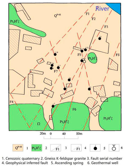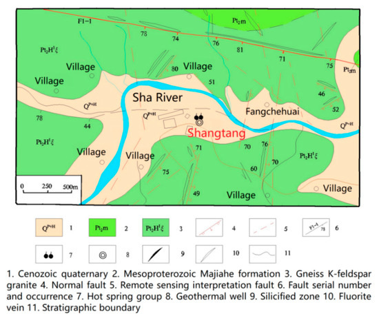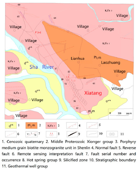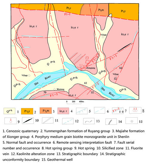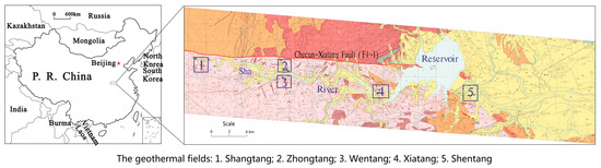 The research area is located at the joint of the Sino-Korean quasi platform and the Qinling fold system, that is, between the North-China plate and the Yangtze plate. As the Yangtze plate subducted and collided with the North China plate, the Qinling mountains became a famous intercontinental orogenic belt. Luanchuan-Queshan-Gushi deep fault in the southern margin of North-China plate is the northern boundary of the orogenic belt, and Xiangfan-Guangji deep fault in the northern margin of Yangtze plate is its southern boundary. Checun-Xiatang fault is a part of Luanchuan-Queshan-Gushi deep fault. The Lushan geothermal belt which has five hot springs is located in the south of the east section of Checun-Xiatang deep fault, 820–3000 m away from Checun-Xiatang fault. The five hot spring areas, Shangtang, Zhongtang, Wentang, Xiatang, and Shentang, are exposed from west to east at an equal distance of 10.5–10.8 km. And then to the east downstream there is the Matang geothermal field, a geothermal prospect investigation area. Figure 1 shows the geothermal fields, the big fault F1-1, the river, and the reservoir.